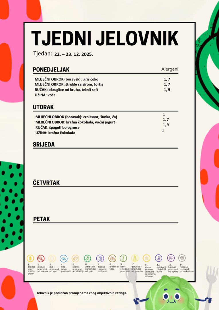 Tjedni jelovnik Jelovnik je podložan promjenama iz objektivnih razloga. ARHIVA Klikom na JELOVNIK, otvara se dokument u PDF obliku. JELOVNIK 22. – 23.12. 2025. JELOVNIK 15. – 19.12. 2025. JELOVNIK 8. – 12. 12. 2025. JELOVNIK 1. – 5. 12. 2025. JELOVNIK 24. – 28. 11. 2025. JELOVNIK 19.11. – 21.11. 2025. JELOVNIK 10. – 14. 11. 2025. JELOVNIK 3. – 7. 11. 2025. JELOVNIK 27. – 31. 10. 2025. JELOVNIK 20. – 24. 10. 2025. JELOVNIK 13. – 17. 10. 2025. JELOVNIK 6. – 10. 10. 2025. JELOVNIK – 29.9. – 3.10. 2025. JELOVNIK 22. – 26. 9. 2025. JELOVNIK 15. – 19. 9. 2025. JELOVNIK 8. – 12. 9. 2025.